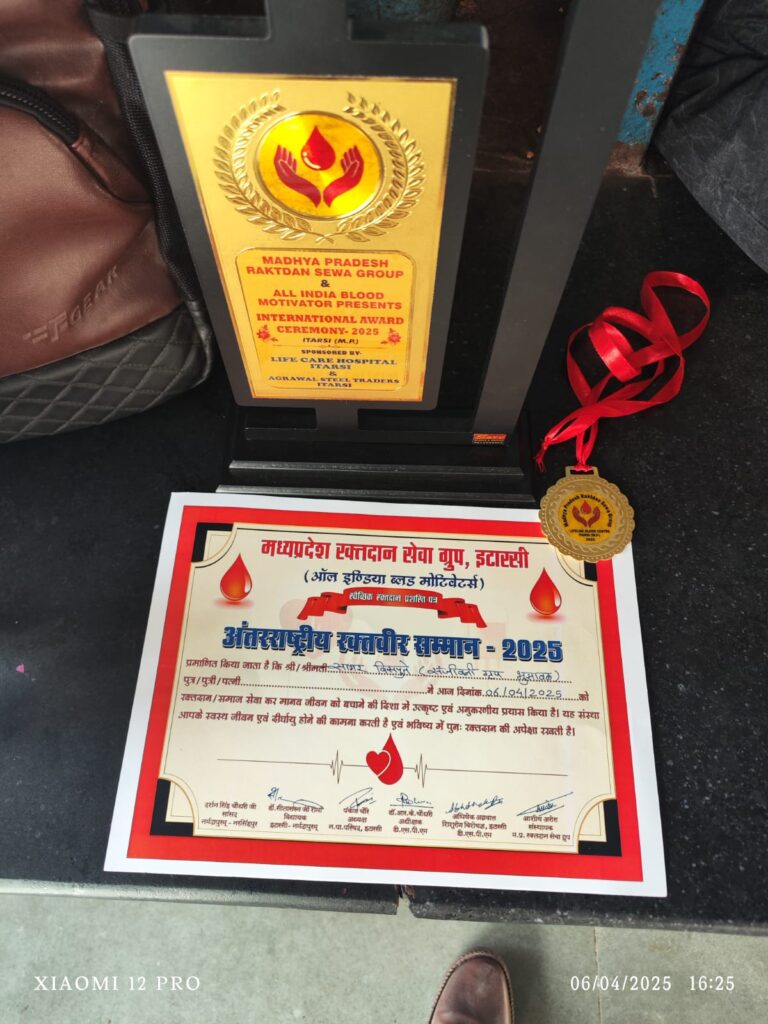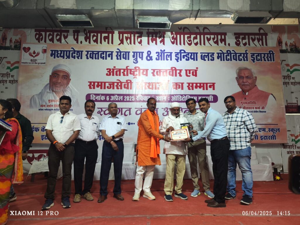 इटारसी, नर्मदापूरम: रक्तदान क्षेत्रातील उल्लेखनीय कार्यासाठी संजीवनी ग्रुप (भुसावळ) तर्फे कार्यरत असलेले सागर विसपुते यांना ‘आंतरराष्ट्रीय रक्तवीर सन्मान पुरस्कार’ प्रदान करण्यात आला. हा सन्मान मध्यप्रदेश रक्तदान सेवा ग्रुप, इटारसी यांच्या वतीने आयोजित विशेष कार्यक्रमात प्रदान करण्यात आला.कार्यक्रमाचे प्रमुख पाहुणे म्हणून माननीय खा. दर्शन सिंह चौधरी (नर्मदापूरम लोकसभा) आणि माननीय डॉ. सीतासरण शर्मा (माजी विधानसभा अध्यक्ष) उपस्थित होते. त्यांच्या हस्ते सागर विसपुते यांना हा मानाचा पुरस्कार प्रदान करण्यात आला.हा पुरस्कार संपूर्ण संजीवनी ग्रुप आणि त्यामधील सर्व रक्तदात्यांच्या सेवाभावाचे प्रतीक म्हणून समर्पित करण्यात आला. सागर विसपुते यांनी हा सन्मान स्वीकारत आपल्या कार्याचा आणि संजीवनी ग्रुपच्या तत्त्वांचा गौरव जागतिक स्तरावर पोहचवला.”हा पुरस्कार माझा नसून संजीवनी ग्रुपच्या प्रत्येक रक्तदात्याचा आहे,” असे भावनिक उद्गार सागर विसपुते यांनी यावेळी काढले. त्यांनी संपूर्ण ग्रुपकडून सर्व रक्तदात्यांचे मनःपूर्वक आभार मानले.संजीवनी ग्रुप हा अनेक वर्षांपासून रक्तदान, आरोग्य शिबिर आणि सामाजिक उपक्रमांत सक्रीय असून, त्यांच्या कार्याची दखल आता आंतरराष्ट्रीय स्तरावरही घेतली जात आहे.